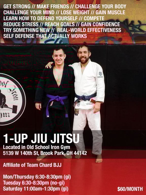“I must say that I love and highly recommend 1-Up Jiu Jitsu!! Paul and Jon are fantastic instructors. I have never done any Jiu Jitsu prior to coming to 1-Up, which for the longest held me back from trying a gym. But deciding to give 1-Up a chance has been one of my greatest decisions. Everyone is super welcoming, the instruction is fantastic and literally everyone is willing to help you out. The classes are fun and you learn a ton every time. Plus, it's super affordable (especially for what you get). Whether you're just looking for something new to do, a new workout, or a potential way to defend yourself in real life situations, do yourself a favor, and give this a try! Jiu Jitsu may not be for everyone, but if you're interested or already know you want to learn this, then look no further than 1-Up Jiu Jitsu!”
